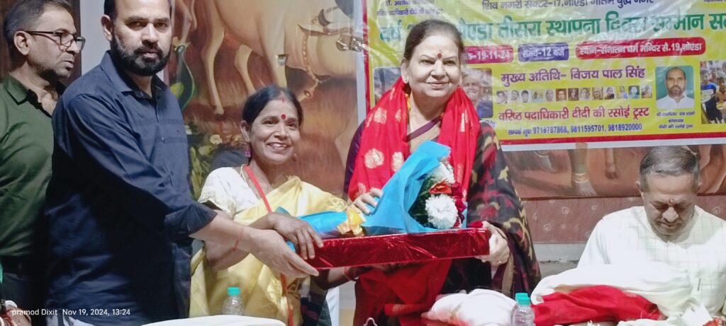 नोएडा गरीबों जरूरतमंदों की सेवा में कार्यरत दीदी की रसोई ट्रस्ट का तीसरा स्थापना दिवस आज सेक्टर 19 नोएडा सनातन धर्म मंदिर में बड़े हर्षोल्लास धूमधाम से मनाया गया। इस अवसर पर दीदी की रसोई ट्रस्ट के कार्यों में सहयोग करने वाले शहर के प्रमुख समाजसेवी महेश सक्सेना, सविता, सुमति, विजयपाल, केपी शर्मा, राहुल भाटिया, विनोद शर्मा, सुरेश अग्रवाल, रेखा चौहान, गुड़िया देवी, भरत, लक्ष्मी नारायण, नवरत्न फाउंडेशन के अध्यक्ष अशोक श्रीवास्तव, पूर्व मंत्री माननीय नवाब सिंह नागर, पूर्व विधायक श्रीमती विमला बाथम एवं शहर के सम्मानित पत्रकार बंधुओ सहित दर्जनों लोगों को सम्मानित किया गया।
