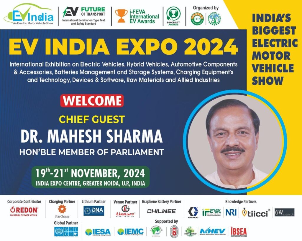 ईवी इंडिया एक्सपो 2024 19 नवंबर 2024 से 21 नवंबर 2024 तक इंडिया एक्सपो सेंटर एंड मार्ट, ग्रेटर नोएडा, यूपी में शुरू हो रहा है। यह लोगों और उद्योग के लिए संसाधनों को साझा करने, उत्पाद और ब्रांड प्रदर्शन के लिए सबसे अच्छा सार्वजनिक इंटरैक्टिव मंच है। इस वर्ष 140 से अधिक प्रदर्शक प्रदर्शनी में भाग ले रहे हैं।